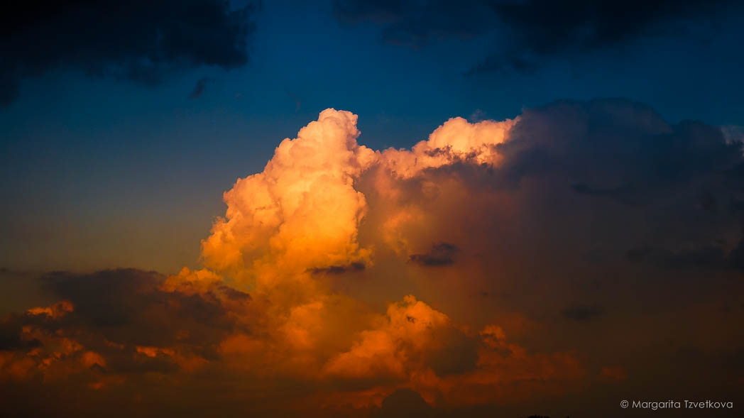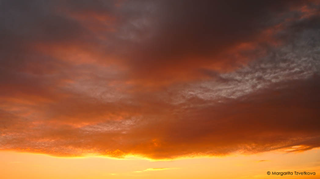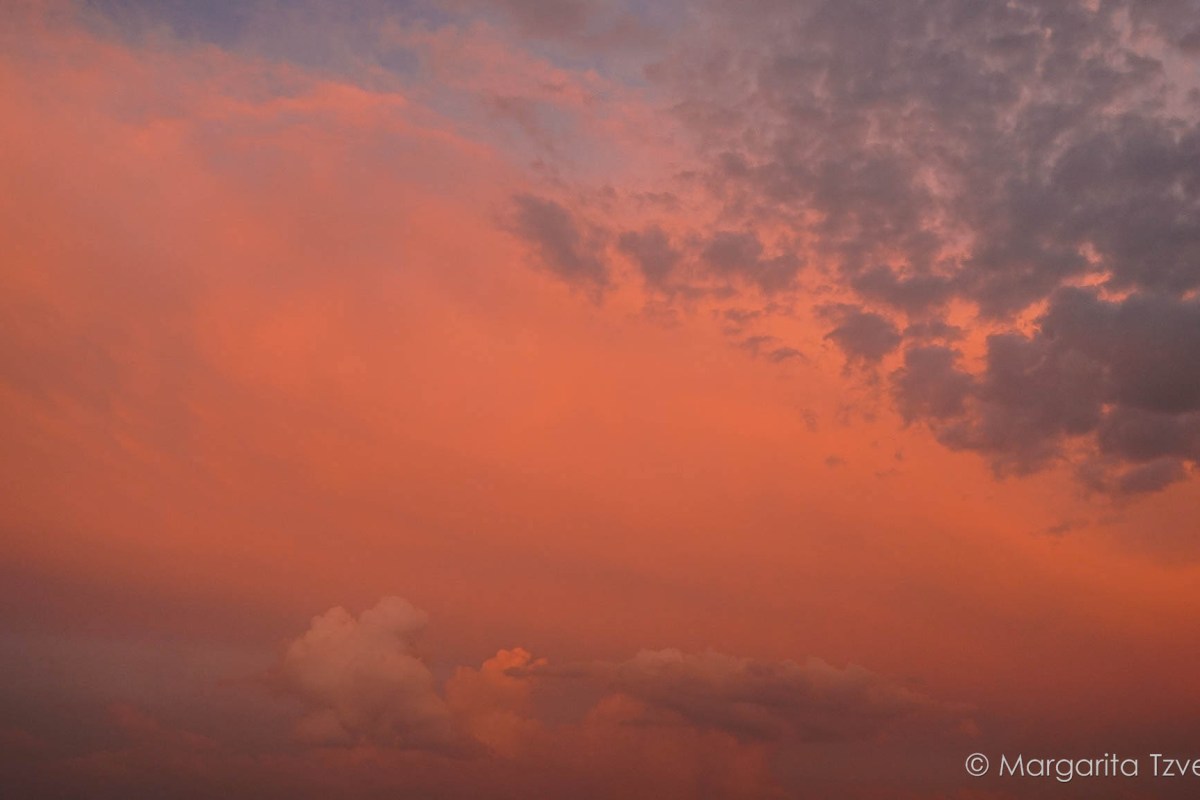 Тази вечер, излизайки от магазина, по навик започнах да оглеждам небето, защото тъкмо беше залезно време. А то, заедно с изгревното време, ми е най-любимата част от денонощието. 😉 Погледнах в посока на залеза – да, прекрасни наситени оранжево-лилави цветове, но гледката се скрива от блоковете наоколо. Погледнах в другата посока – срещу залеза …. и видях невероятни облаци – и като форма, и като цвят! Просто оставих торбите с покупки на земята, извадих телефона и започнах да снимам. Около мен минаваха хора, заобикаляха ме и усещах как се чудеха защо така стоя по средата на улицата и какво правя… Няколко дори ми се издразниха съвсем открито… 🙂 Имаше достатъчно място да се мине около мен, но как така си позволявам да стоя тук по средата, и с едни торби?! Точно тези, раздразнените, започнаха да се обръщат, коментирайки ме осъдително и проследиха посоката, в която снимах… и в този момент чух едно от най-искрените възклицания в живота си: “Ехааааа, колко е красиво!!” … И отново усетих мощна емоция, извираща от тяхната посока, но този път – на благодарност, наслада, удоволствие! Каква бърза, мигновена промяна в настроението! Как една красива, естествена природна гледка, е способна да “влезе” в човека и да извади от него мекота, спокойствие, възторг… и приемане…! Усмихнах им се, без да кажа нищо, и те ми се усмихнаха в отговор, но погледите, които си разменихме, си казаха толкова много за тези няколко секунди! Аз бях “виновна”, че “се пречкам”, но бях “виновна” и за тази емоционална промяна, за тази пауза в тяхното бързане, за тези възклицания, за тази поета глътка вълшебство…